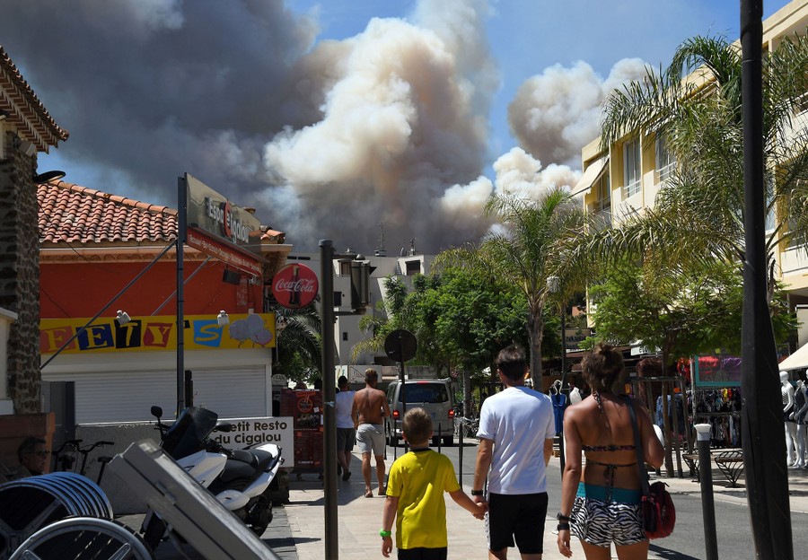 Read morePeople walk in the street as smoke rises from a fire burning a forest in Bormes-les-Mimosas, southeastern France, on July 26, 2017. #