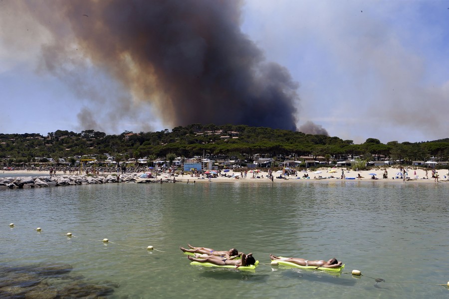 Read moreFlames and smoke fill the sky above a burning hillside as tourists swim on the beach in Bormes-les-Mimosas, in the Var department, France, on July 26, 2017. #