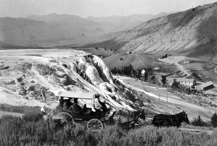 Read moreIn 1905, a stagecoach takes tourists past Jupiter Terrace in Mammoth Hot Springs, Yellowstone National Park. The buildings of Fort Yellowstone can be seen in the distance. #