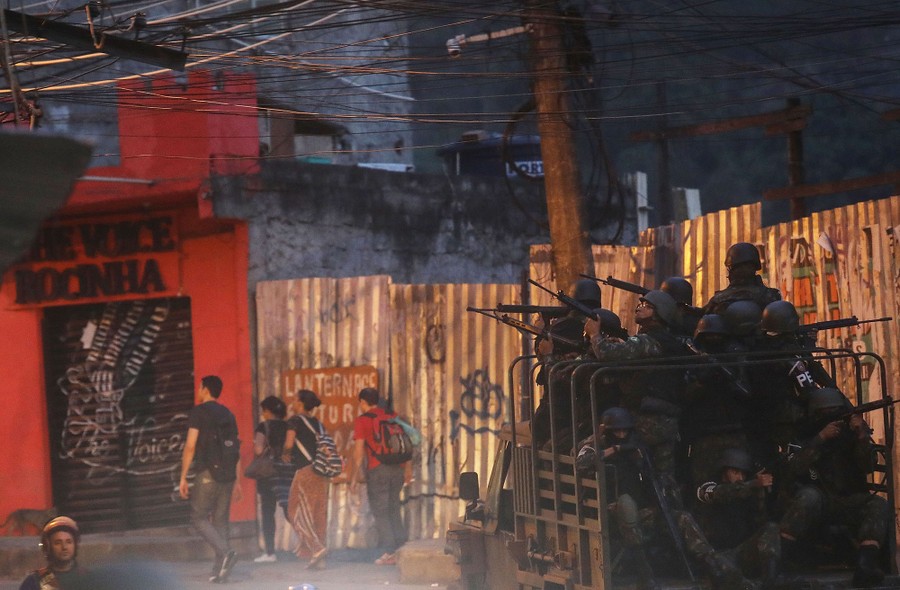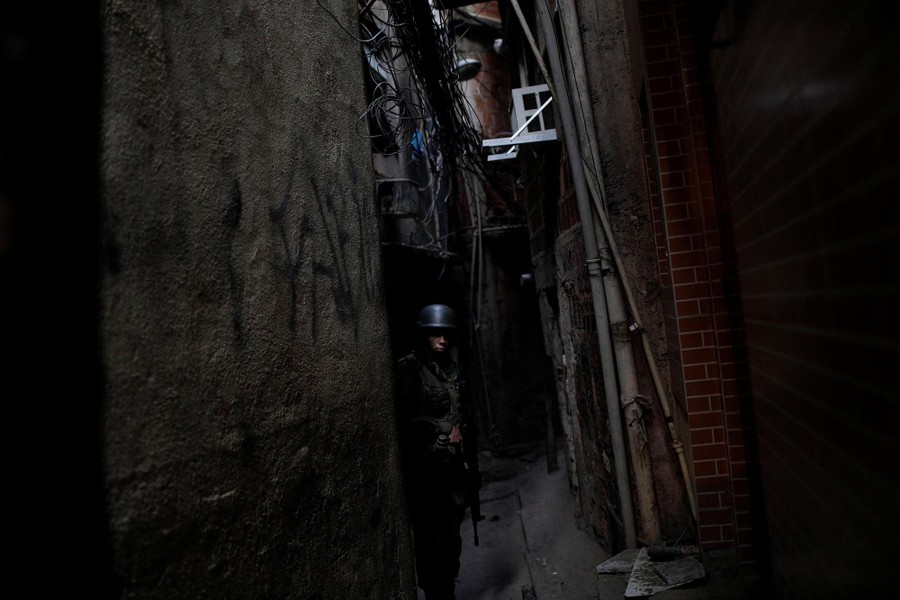 Read moreBrazilian army military police patrol an alley in the Rocinha favela in Rio de Janeiro, Brazil, on September 25, 2017. Shootouts had erupted in several areas of Rio on September 22, prompting Brazilian authorities to shut roads, close schools, and ask for the Army to intervene. #