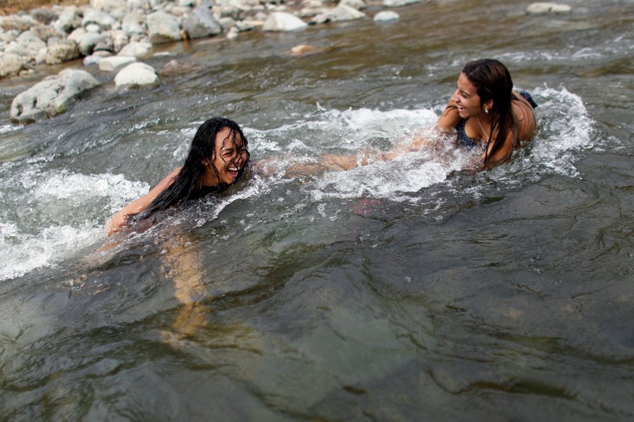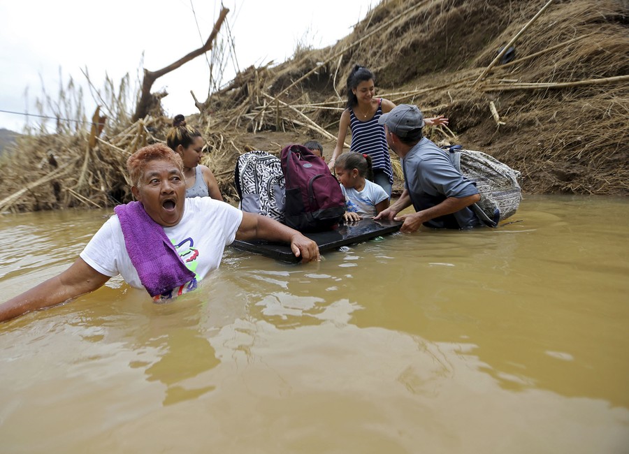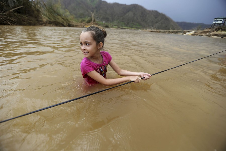 Read moreMarta Sostre Vazquez reacts as she starts to wade into the San Lorenzo Morovis River with her family after the bridge was swept away by Hurricane Maria in Morovis, Puerto Rico, on September 27, 2017. The family was returning to their home after visiting family on the other side. #