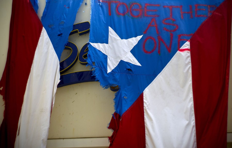 Read moreA damaged Puerto Rican national flag spray painted with the words "Together as One" hangs from the facade of a business, in San Juan, Puerto Rico, on September 27, 2017. The relief effort from Hurricane Maria in Puerto Rico has so far been concentrated largely in San Juan, and many outside the capital say they've received little or no help. #