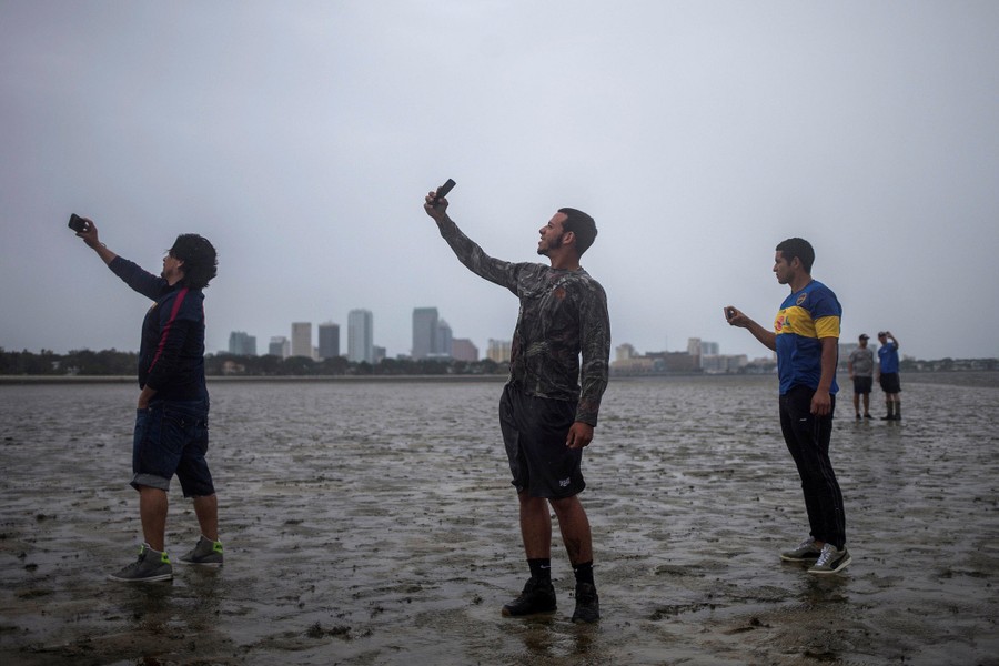 Read moreThe Tampa skyline is seen in the background as local residents (from left) Rony Ordonez, Jean Dejesus, and Henry Gallego take photographs after walking into Hillsborough Bay ahead of Hurricane Irma in Tampa, on September 10, 2017. #
