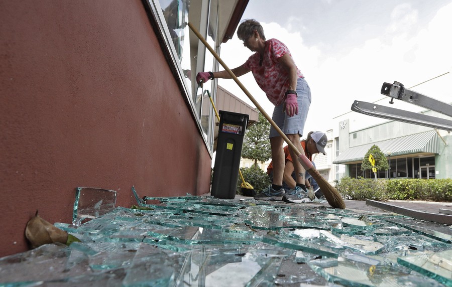 Read moreBuilding owner Catharine Taylor Woods, front, and Jessica Newman, of the City of Wauchula, clean up broken glass after an awning blew off in Hurricane Irma and broke several windows on September 11, 2017. #