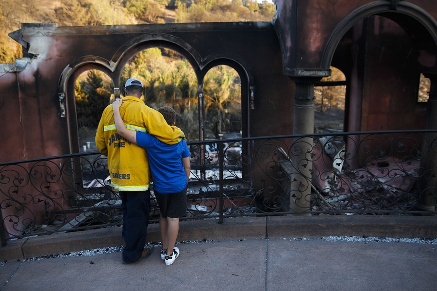 Read moreFirefighter Terry Sanders and son Isaac, 11, who lost their home in a wildfire, comfort each other in front of their neighbor's home destroyed by the same wildfire after trying to find sentimental items belonging to the neighbor in Santa Rosa on October 14, 2017. #