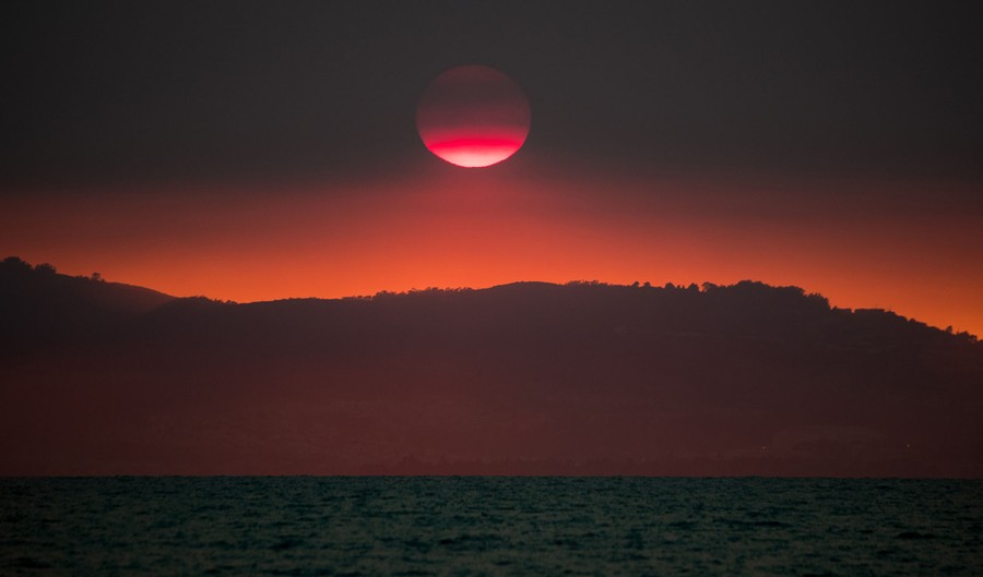 Read moreSmoke from wildland fires in rural Sonoma County, Napa County, Mendocino County, and other nearby North Bay counties has been pushed approximately 45 miles into the San Francisco Bay, tinting the sunlight seen from Alameda, California, on October 12, 2017. #