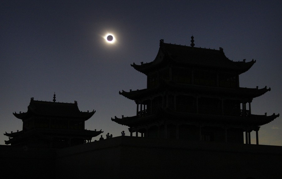 Read moreA solar eclipse, called 'Rishi,' meaning 'eaten sun' in Chinese, can be seen above visitors at the Jiayuguan Fort on the Great Wall of China in the town of Jiayuguan, Gansu Province, on August 1, 2008. #