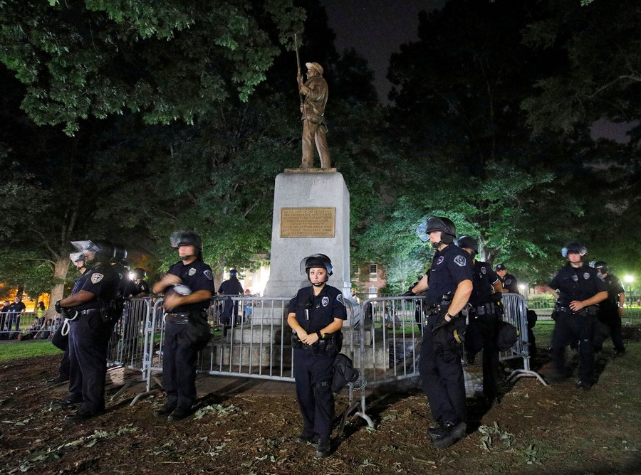 Read morePolice wearing riot gear guard a statue of a Confederate soldier nicknamed Silent Sam on the campus of the University of North Carolina during a demonstration for its removal in Chapel Hill, North Carolina, on August 22, 2017. #