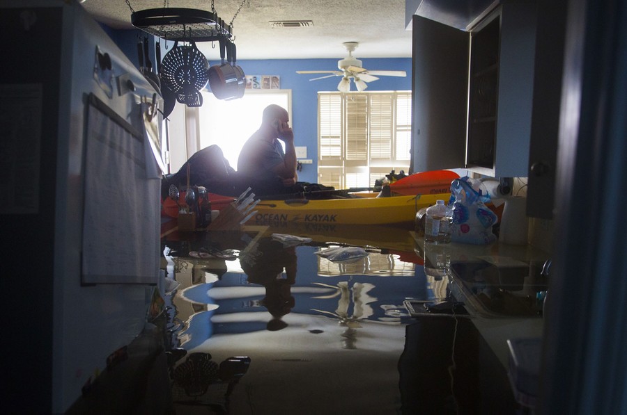 Read moreLarry Koser Jr., seated in a kayak floating at cabinet height in his kitchen, calls his wife looking for important papers and heirlooms inside his father's house after it was flooded by heavy rains from Hurricane Harvey on August 29, 2017, in the Bear Creek neighborhood of west Houston. The neighborhood flooded after water was released from nearby Addicks Reservoir. #