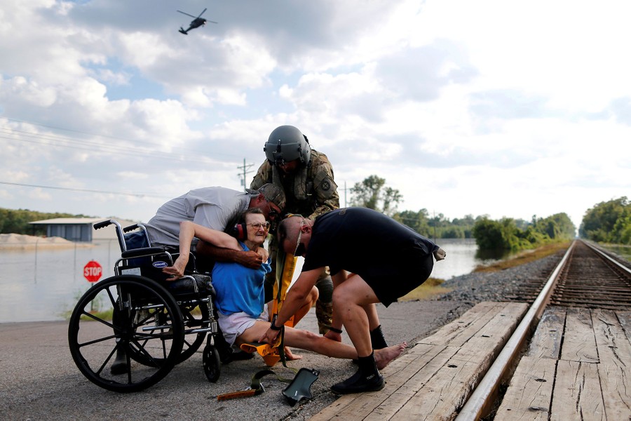 Read moreRescue personnel help Hersey Kirk into a restraint as a rescue helicopter hovers in the distance after she was rescued from her home flooded by Hurricane Harvey in Rose City, Texas, on August 31, 2017. #
