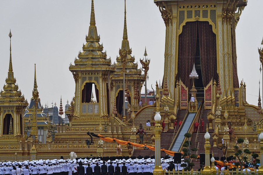 Read moreThe funeral urn of the late Thai King Bhumibol Adulyadej is transported up a ramp into the royal crematorium as officials watch during his elaborate funeral procession in Bangkok on October 26, 2017. #
