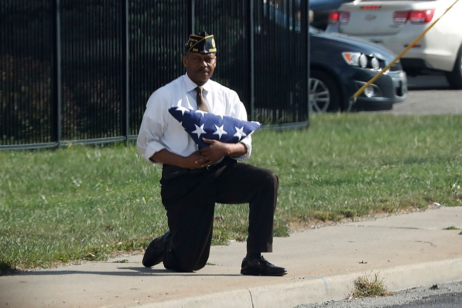 Read moreUnited States Army veteran Marvin L. Boatright kneels with a folded U.S. flag as the motorcade of President Donald Trump passes him after an event at the state fairgrounds in Indianapolis, Indiana, on September 27, 2017. The act was one of protest, spelled out in an interview with Boatright, who was upset with the President's remarks about protesting NFL players. #