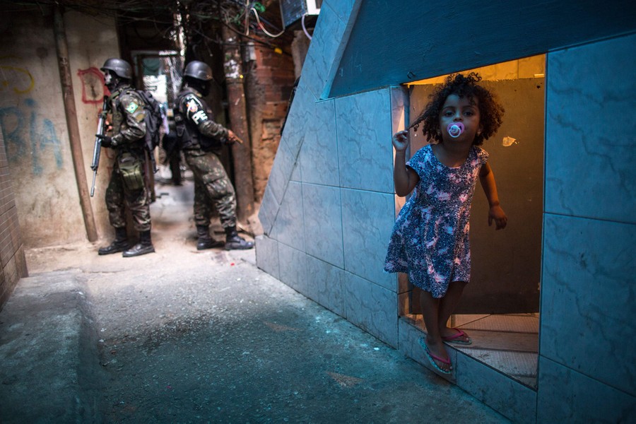 Read moreBrazilian army military police patrol an alley in the Rocinha favela in Rio de Janeiro, Brazil, on September 25, 2017. Shootouts had erupted in several areas of Rio on September 22, prompting Brazilian authorities to shut roads, close schools, and ask for the army to intervene. #
