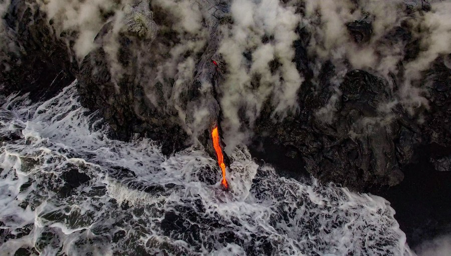 Read moreDrip. Third Place, Aerials. On the flanks of Kilauea Volcano, Hawai’i, the world’s only lava ocean entry spills molten rock into the Pacific Ocean. After erupting in early 2016, the lava flow took about two months to reach the sea six miles away. #
