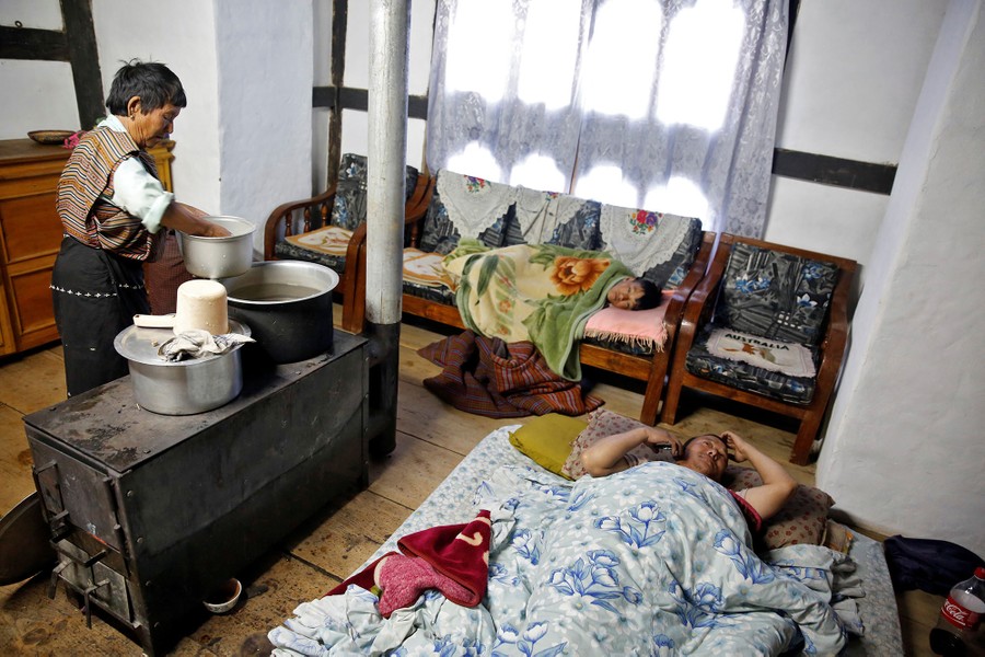 Read moreFarmer Ap Daw (right), 43, talks on his mobile phone as his son Sonam Tshering, 13, lies on a couch and his mother Aum Sangay, 68, heats water at their home in the Phobjikha Valley, on December 15, 2017. "Children are spending more time on their mobile phones and not studying," said Daw who also bemoans the rising mounds of trash by the highway. #