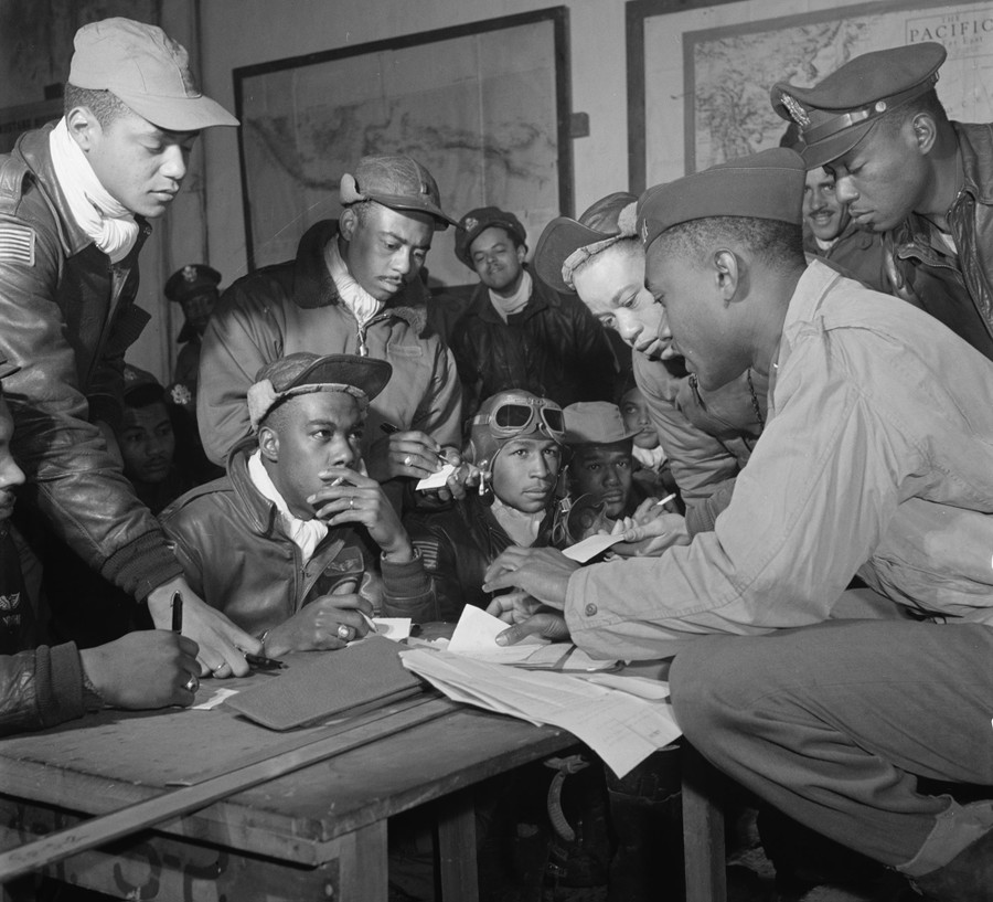Read moreSeveral Tuskegee airmen. Front row, left to right: unidentified airman; Jimmie D. Wheeler (with goggles); Emile G. Clifton (cloth cap), San Francisco. Standing left to right: Ronald W. Reeves (cloth cap), Washington, D.C.; Hiram Mann (leather cap); Joseph L. "Joe" Chineworth (wheel cap), Memphis; Elwood T. Driver(?), Los Angeles; Edward "Ed" Thomas (partial view); Woodrow W. Crockett (wheel cap); in Ramitelli, Italy, in March of 1945. #