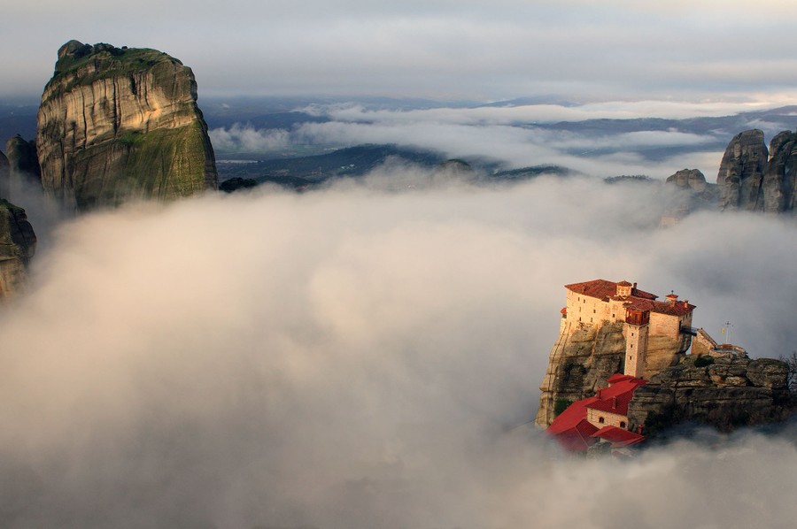 Today’s entry is the first of a semi-regular Travel Monday series, with virtual photo trips to interesting, unusual, difficult-to-reach, or simply beautiful parts of our planet. Today, we’re visiting the amazing clifftop monasteries of Meteora in central Greece. Monks and hermits have been finding refuge in this unique rock formation for more than a thousand years. Six Eastern Orthodox monasteries—some dating back to the 14th century—remain in place, still home to a small number of monks and nuns. Meteora is listed as a UNESCO World Heritage Site, and welcomes thousands of tourists every year. Gathered below, a collection of images of Meteora, the ancient structures atop its massive rock pillars, and the village and countryside below.