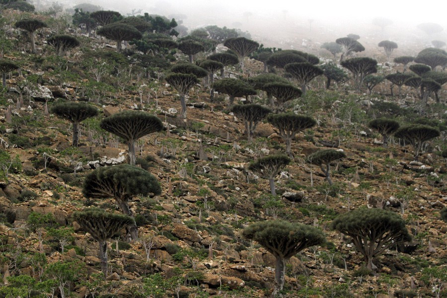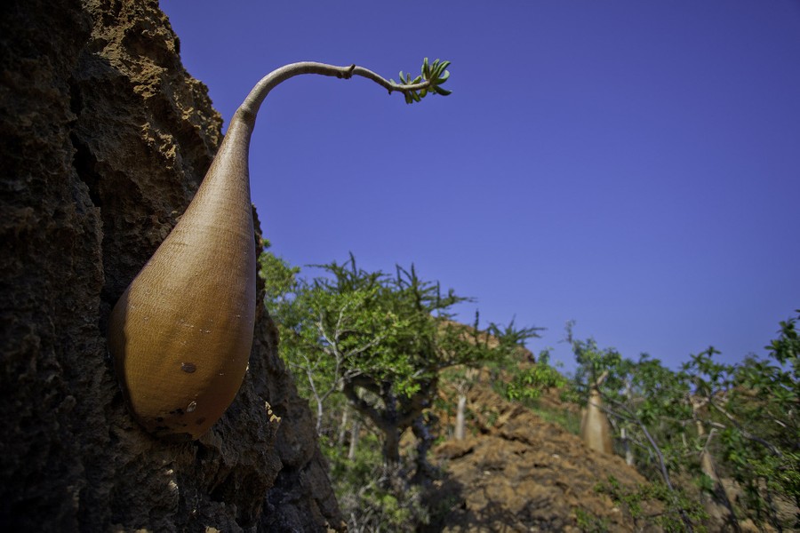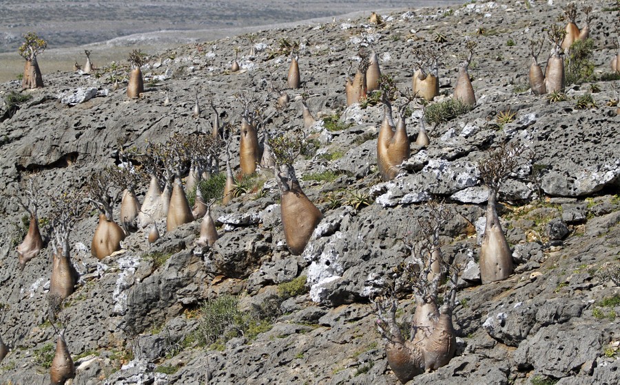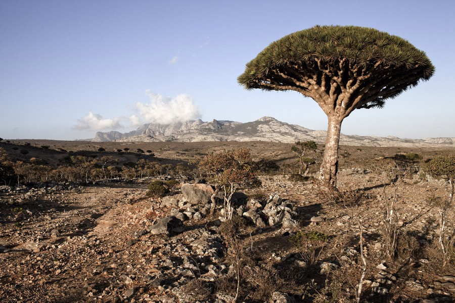 Off the coast of Yemen, in the Arabian Sea, lies isolated Socotra Island, where hundreds of plants and animals have developed into species unique to the island. Socotra is the largest island in an archipelago that includes three other islands. The Socotra Archipelago has been isolated from any large landmass for millions of years, and is now home to a surprising display of biodiversity. Probably the best-known of its endemic flora is the dragon blood tree, with red-colored sap and tightly-clustered branches that look like roots turned upside down. Below, a collection of images of the landscape of Socotra, and the plants and animals that call it home.