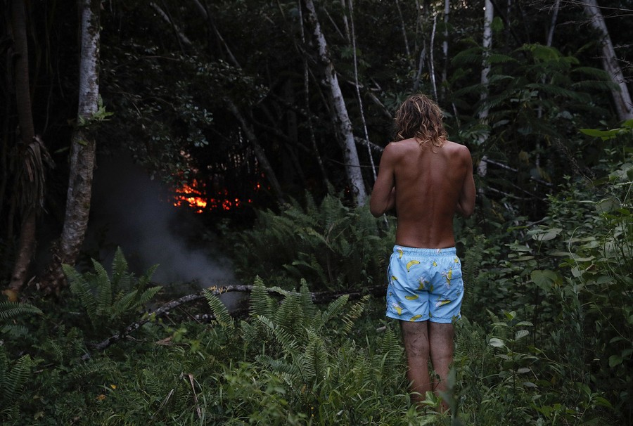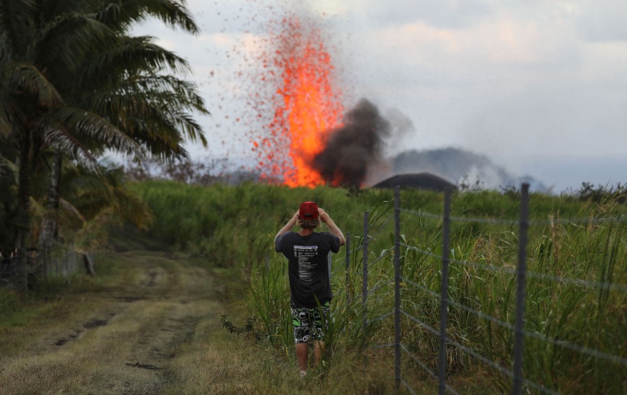 Read moreJack Jones, visiting from Madison, Wisconsin, takes pictures at a country club in Volcano, Hawaii, as a huge ash plume rises from the summit of Kiluaea on May 21, 2018. #