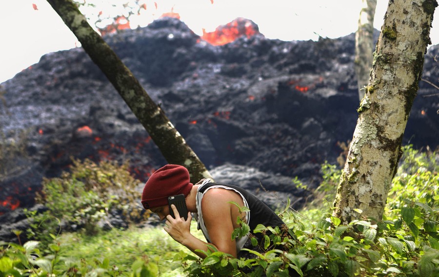Read moreAn onlooker talks on his phone as a lava fissure erupts nearby, in the aftermath of eruptions from the Kilauea volcano on Hawaii's Big Island, on May 12, 2018, in Pahoa, Hawaii. #