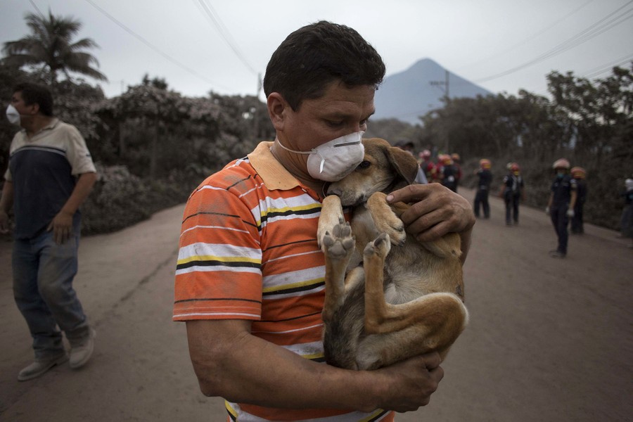 Read moreA resident cradles his dog after rescuing him near the Fuego volcano in Escuintla on June 4, 2018. #