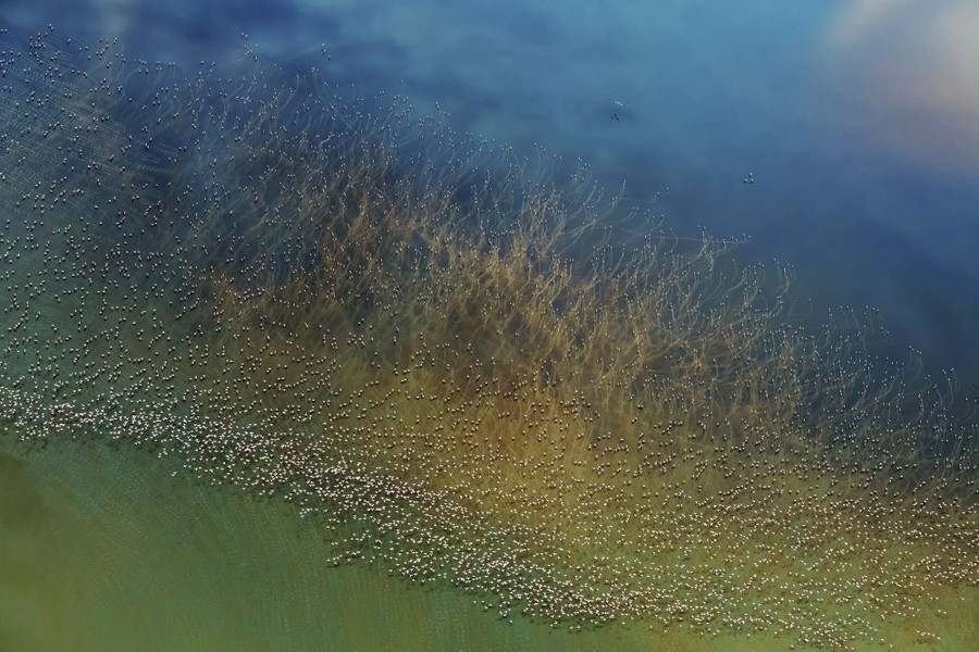Read moreFlamingos Taking Off. Second place, Nature. "Thousands of flamingos are seen taking off from the colorful Lake Natron in Tanzania. Before taking off, flamingos need to take a short run on water to build up some speed. At that moment, their long, red legs create a series of water ripples on the surface of the lake. Looking down from the helicopter, these ripple lines look like giant aquatic plants flowing in the water. This photo was taken from a helicopter." #