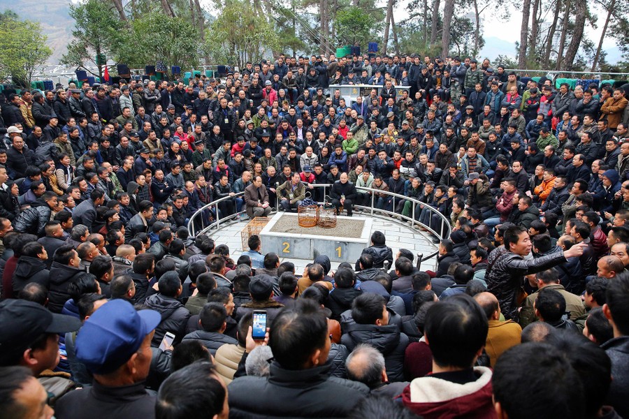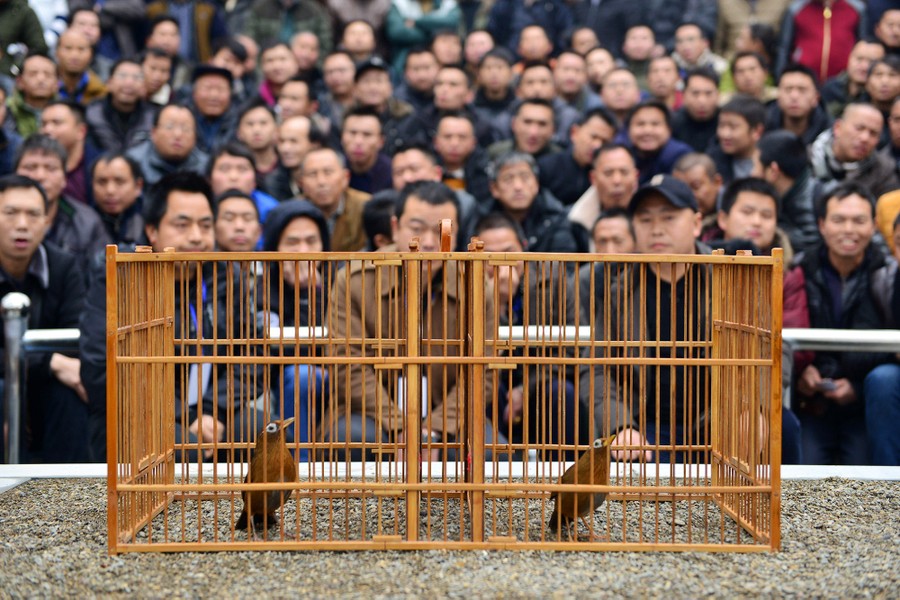 Read moreSpectators watch a traditional thrush fight to celebrate the upcoming New Year in Jianhe County on January 24, 2018. Miao and Dong people have a long tradition of raising and training birds. #