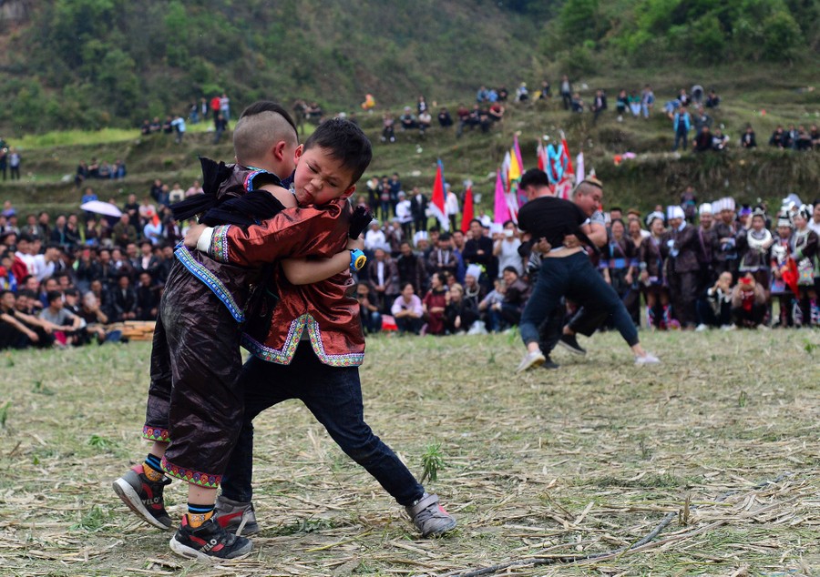 Read moreDong children compete in a wrestling competition at Kengdong Village on March 31, 2018 in Qiandongnan Prefecture. Villagers from 13 ethnic minority groups attended the annual wrestling competition to welcome spring harvest. #