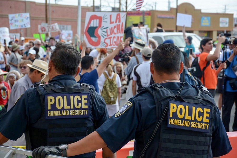 Read moreHomeland Security police officers watch over protesters at the Paso Del Norte port of entry, an international bridge connecting Juarez, Mexico in downtown El Paso, Texas, on June 30, 2018. #