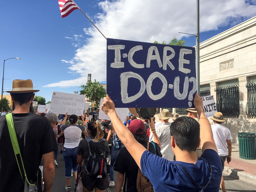 Read moreA sign lampoons U.S. first lady Melania Trump’s “I don’t really care, do u?” jacket worn on a recent border visit, as protesters approach the international bridge, during a protest march in downtown El Paso, Texas, on June 30, 2018. #