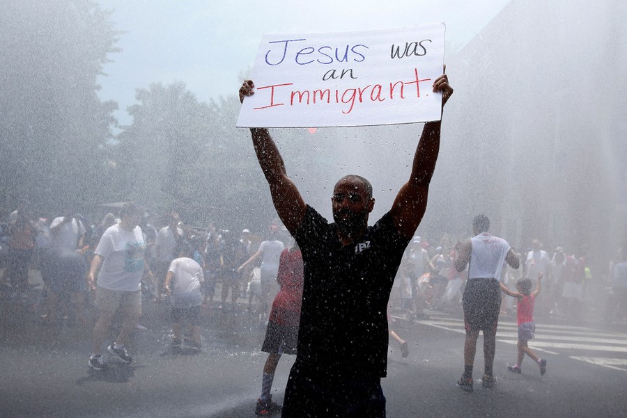 Read moreJonathan Reed of Silver Spring, Maryland, holds up a sign as he stands in a spray of water from a fire truck during rally by immigration activists to protest against the Trump Administration's immigration policy outside the White House in Washington, D.C., on June 30, 2018. #