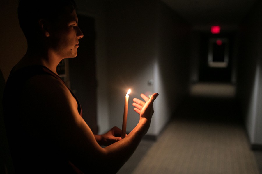 Read moreRichardson Tumulak brings a candle into an elderly couple's room after the Sleep Inn hotel they were staying in lost power on September 13, 2018, during Hurricane Florence. #