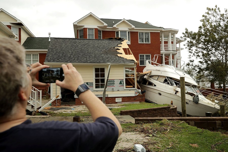 Read moreA neighbor takes photographs of a boat smashed against a garage, left there by the high winds and storm surge of Hurricane Florence, along the Neuse River in New Bern on September 15, 2018. #