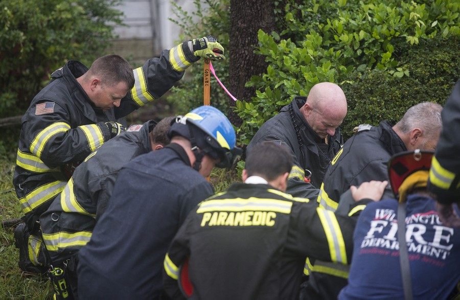 Read moreFirefighters pray during an operation to remove a tree that fell on a house and killed two residents as Hurricane Florence made landfall in Wilmington on September 14, 2018. #