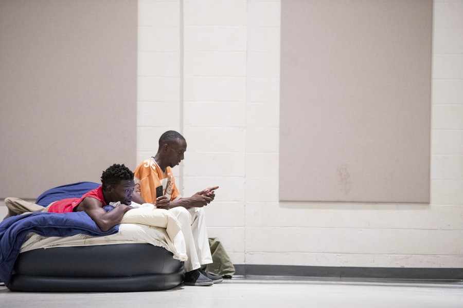 Read moreEric Edwards Jr. (left) and Elliott Farmer Jr. look at their phone while resting on an inflatable mattress in a storm shelter at Washington Street United Methodist Church in Columbia, South Carolina, on September 14, 2018. #