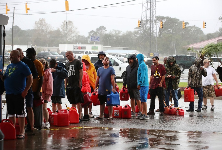 Read morePeople wait in line to fill up their gas cans at a gas station that was damaged when Hurricane Florence hit the area on September 15, 2018, in Wilmington, North Carolina. #