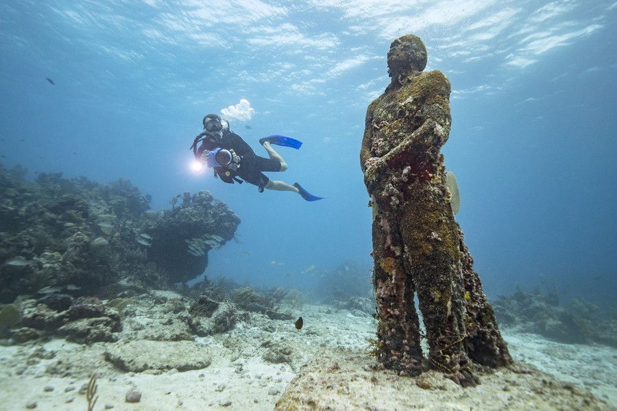 Read moreA diver photographs a massive statue of a man at the Museo Subacuatico de Arte off the coast of Isla Mujeres, Mexico, on September 26, 2018. The statue is part of a larger artwork of more than 500 permanent life-sized and monumental sculptures by the English artist Jason deCaires Taylor. All of the sculptures are fixed to the seabed and made from specialized materials to promote coral life. The total installation occupies more than 420 square meters of barren substrate and weighs in at more than 200 tons. #