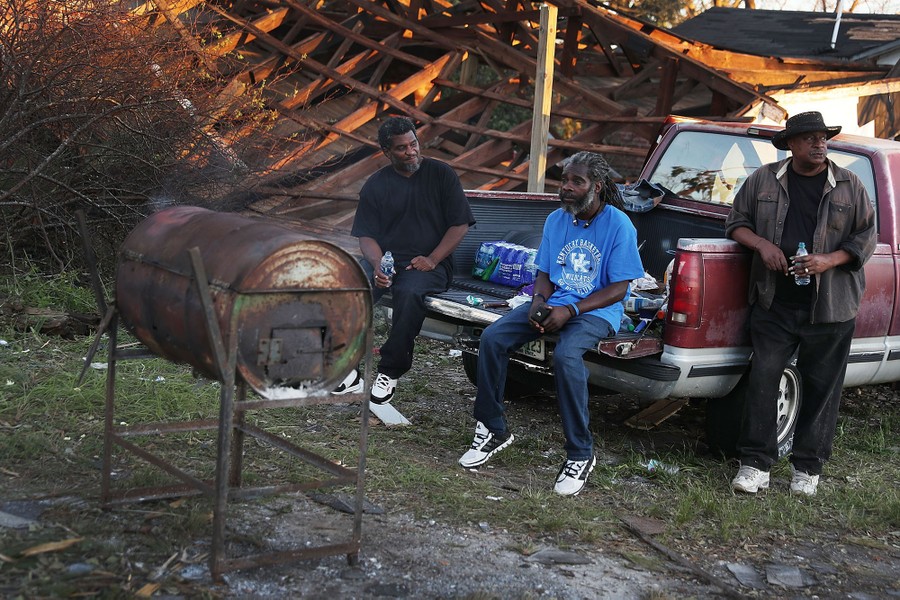 Read moreAntwone Lollis, Joe Price, and Alfred Barnes (from left) wait for their dinner to cook on a grill outside Alfred's house, since it has no electricity after Hurricane Michael passed through, on October 12, 2018, in Panama City. #