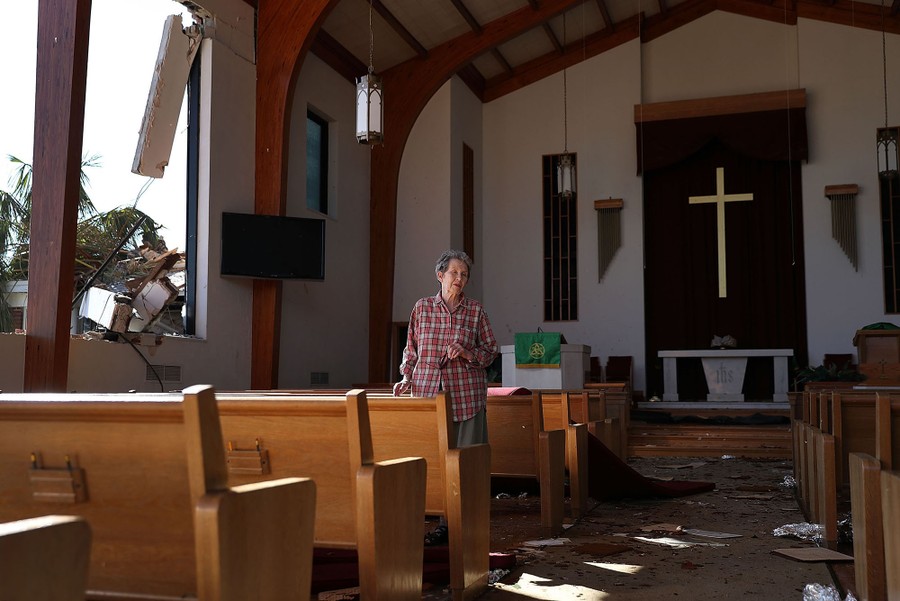Read moreCynthia Biegler, 81, stands in the church that she has attended since 1962, after two of the exterior walls were blown down when Hurricane Michael passed through, on October 13, 2018, in Panama City, Florida. #