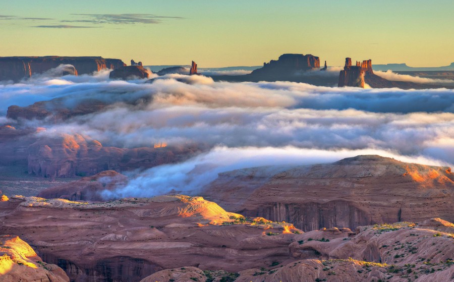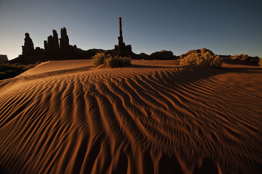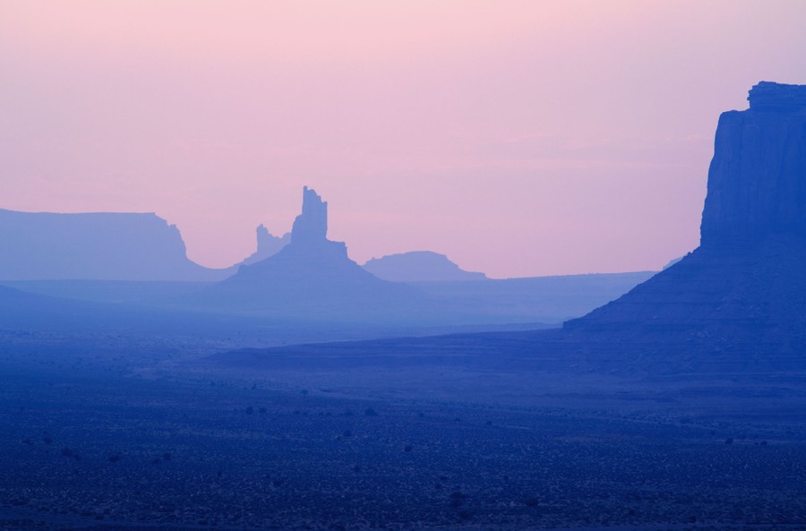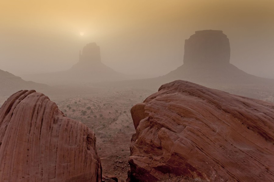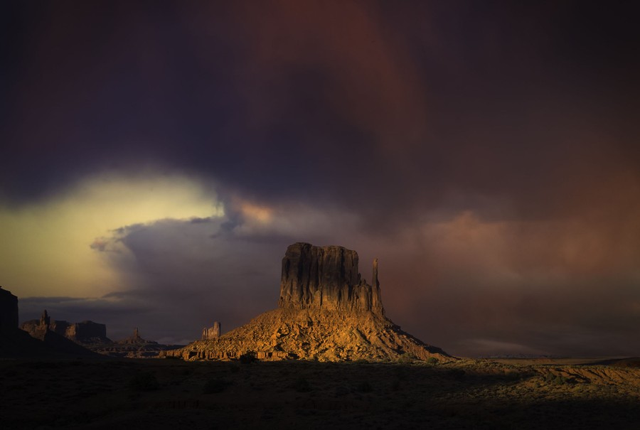 Monument Valley sits on the Utah-Arizona border, within the Navajo Nation reservation. The iconic sandstone buttes that dot the valley floor can mostly be accessed or viewed from Monument Valley Navajo Tribal Park, which—though instantly recognizable—has many fewer visitors annually than the nearby Grand Canyon. Gathered here, a collection of images of some of the many moods of the valley, from wild storms to dusky evenings to bright, sunlit panoramas.