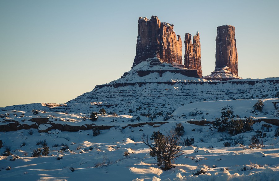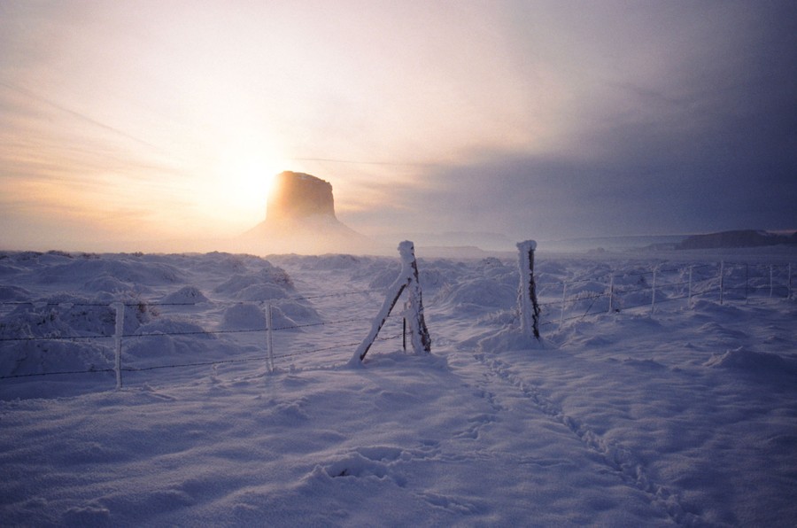 Read moreA snow-covered field, photographed near one of the buttes of Monument Valley #