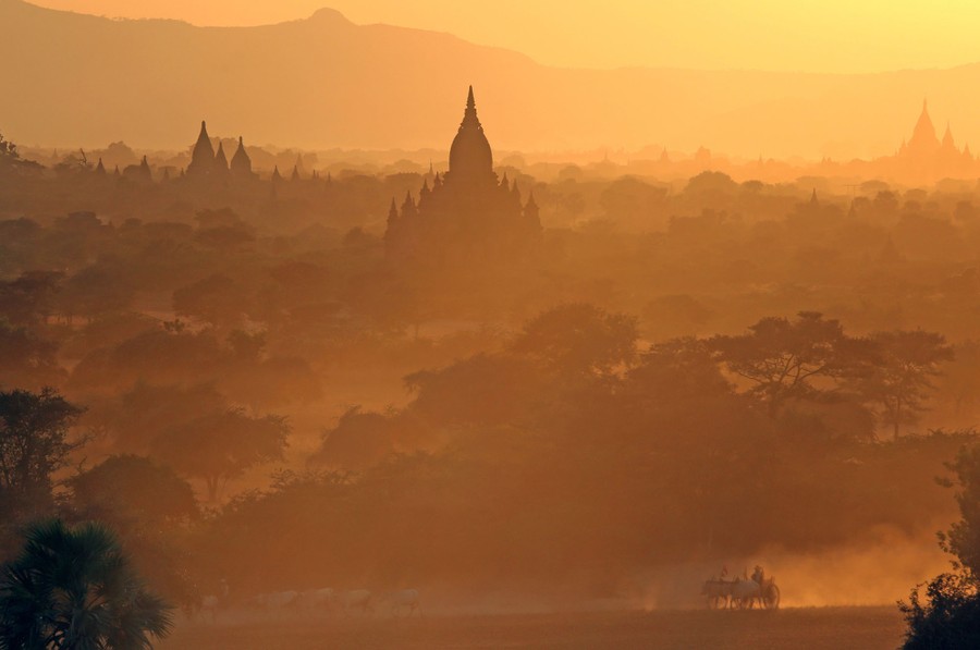 Read morePeople are transported in a cattle-drawn cart as they pass in front of the ancient pagodas at Bagan, Myanmar, on February 3, 2014. #