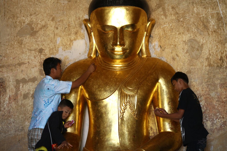 Read moreBoys apply gold leaf onto a Buddha statue at a temple in Bagan on November 9, 2010. #