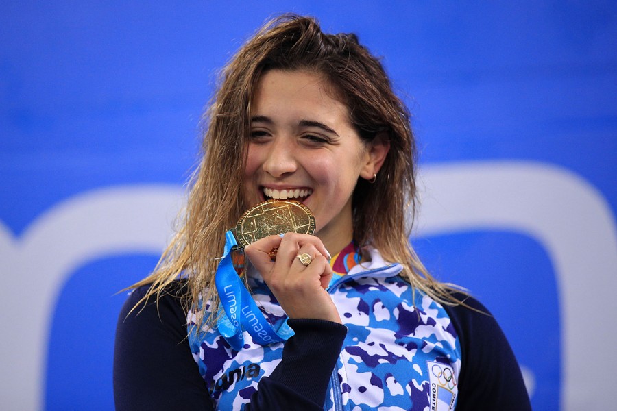 Read moreThe gold medalist Delfina Pignatiello of Argentina celebrates after winning the women's 400-meter freestyle final A at the Aquatics Center of Villa Deportiva Nacional on day 11. #