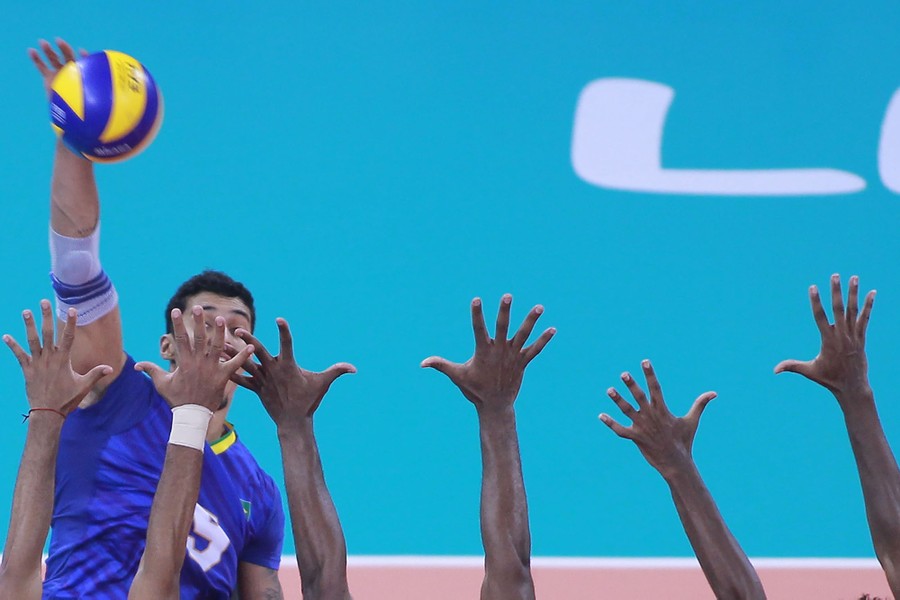 Read moreEduardo Loh of Brazil spikes the ball during the men's volleyball semifinal match between Brazil and Cuba at Polideportivo Callao of Villa Deportiva Regional del Callao on day eight. #