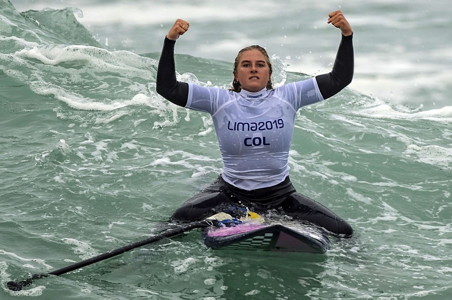 Read moreColombia's Isabella Gomez celebrates after winning the gold medal in the women's surfing SUP final during the 2019 Pan American Games at Punta Rocas beach in Lima on August 4, 2019. #