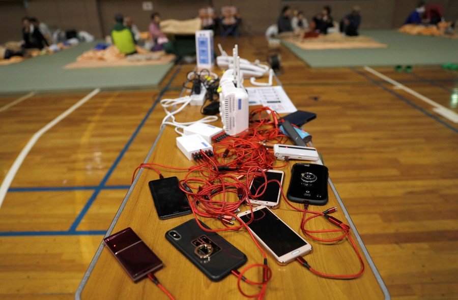 Read moreMobile phones are charged in the evacuation center for those affected by flooding in Nagano on October 13, 2019. #