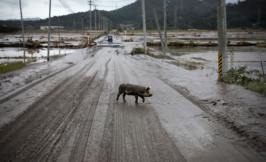Read moreA pig walks on a road in a flooded area of Marumori, Miyagi prefecture, on October 14, 2019. #