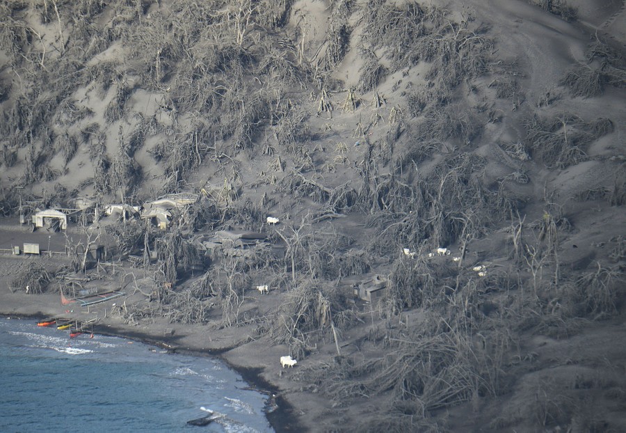 Read moreA small herd of white cows stands among destroyed trees and buildings at the foot of Taal Volcano, as seen from a Philippine air-force helicopter during an aerial survey in the town of Agoncillo on January 21, 2020. #