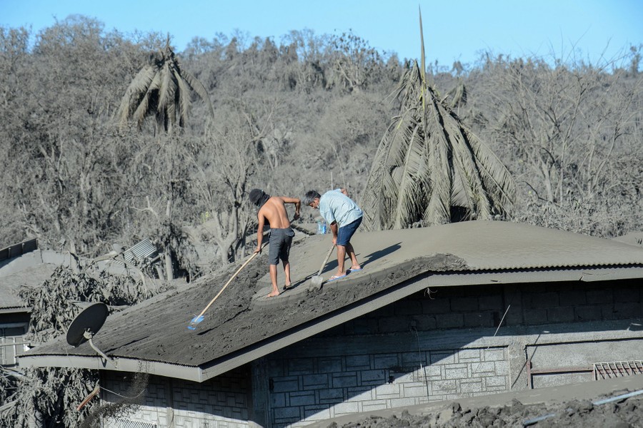 Read moreResidents clean the roof of their home, covered in mud and ash due to the eruption of nearby Taal Volcano in a village in Laurel, Batangas province, on January 16, 2020. #